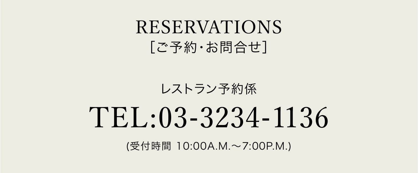 ※レストランの表記料金には、消費税が含まれております。別途、会計時にサービス料(15%)を加算させていただきます。※仕入れの状況により、食材・メニューが変更になる場合がございます。※当社のレストラン、宴会場などにおける食物アレルギー対応につきましては、食品表示法により製造会社など(当社の食材仕入先)に表示義務のある特定原材料 7 品目(えび・かに・小麦・そば・卵・乳・落花生)のみとさせていただきます。特定原材料 7 品目の対応をご希望のお客さまは事前にお申し出ください。※当社ではすべての飲食物を同一環境で取り扱うため、使用原材料以外のアレルゲンの微量混入を完全に防止する事ができません。※当社のアレルゲン情報(特定原材料 7 品目)は、使用原材料及び製造会社などからの原材料情報(食品表示)を基にご案内いたします。※お客さまへ安全なお料理・お飲みものの提供が困難な場合には、ご利用をお断りさせていただく場合がございます。※一部アレルギー対応できないメニューがございます ※写真はイメージです。