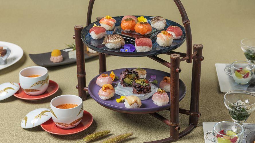 「冬の日本庭園」をテーマにした季節を味わう和のアフタヌーンティー。大トロや、雲丹を乗せた中トロなどを含む手毬寿司に加え、雪の中に咲く椿をイメージしたアレンジ寿司やズワイ蟹をたっぷりとのせた茶わん蒸しなどをご用意いたしました。ご家族やご友人と冬のジャパニーズアフタヌーンティーをぜひお楽しみください。