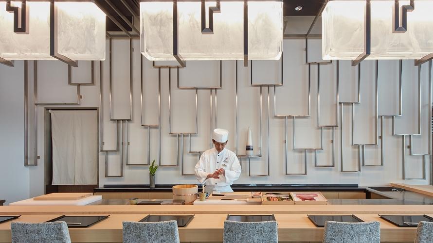 和食を提供するメインダイニング。旬の素材の鮮度を閉じ込めてお届けするイメージを込めた「アイス」をコンセプトに、クリスタル調のインテリアなどで店内を演出します。ダイニングエリアのほか、日本酒を楽しめるSAKEバーや鉄板焼カウンターと寿司カウンター、個室を備え、お客さまのスタイルに合わせてご利用いただけます。
