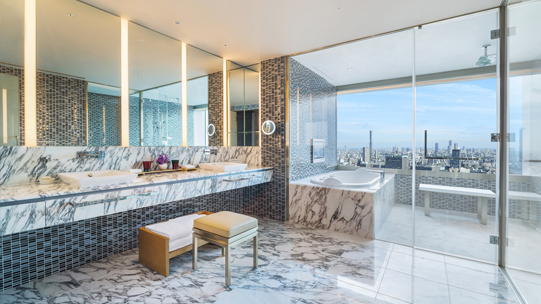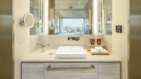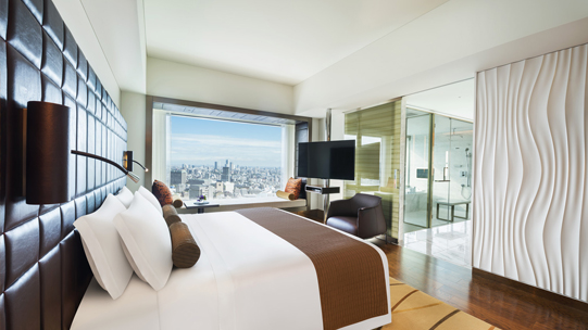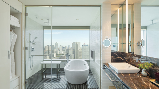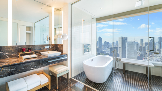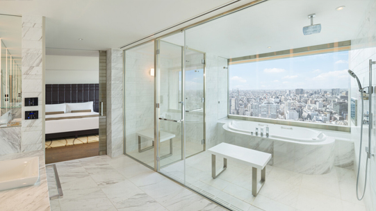 広々とした空間とテレビ付きのビューバスが特徴のジュニアスイートクラス。窓際のコーナーから2方向に開けたダイナミックな都心の景観をお楽しみいただけます。