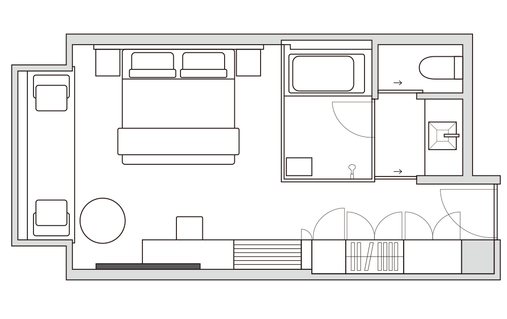 解放感のある大きなバスルームを完備。窓際のデイベッドからアートのような都心の景色をお楽しみいただけます。