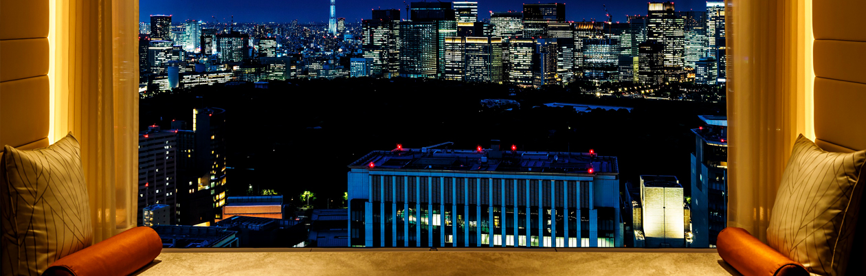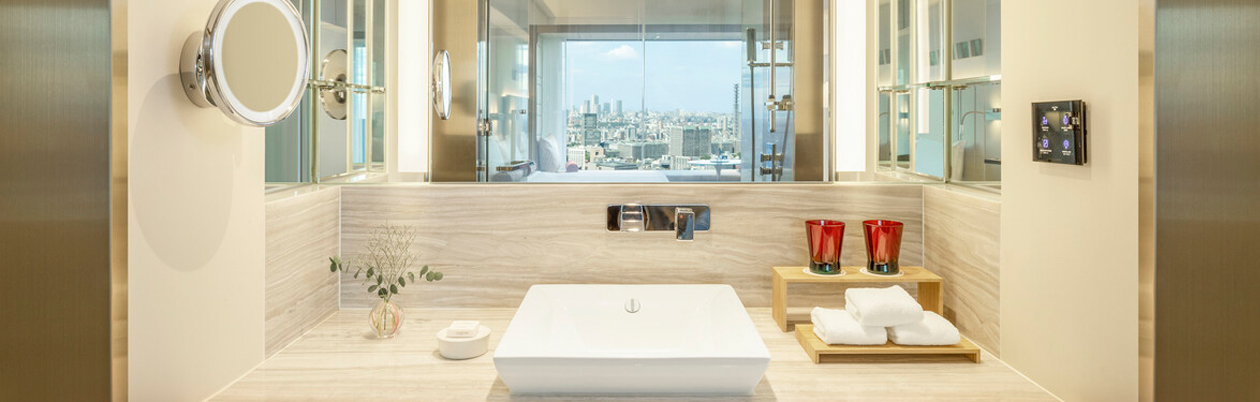 解放感のある大きなバスルームを完備。窓際のデイベッドからアートのような都心の景色をお楽しみいただけます。
