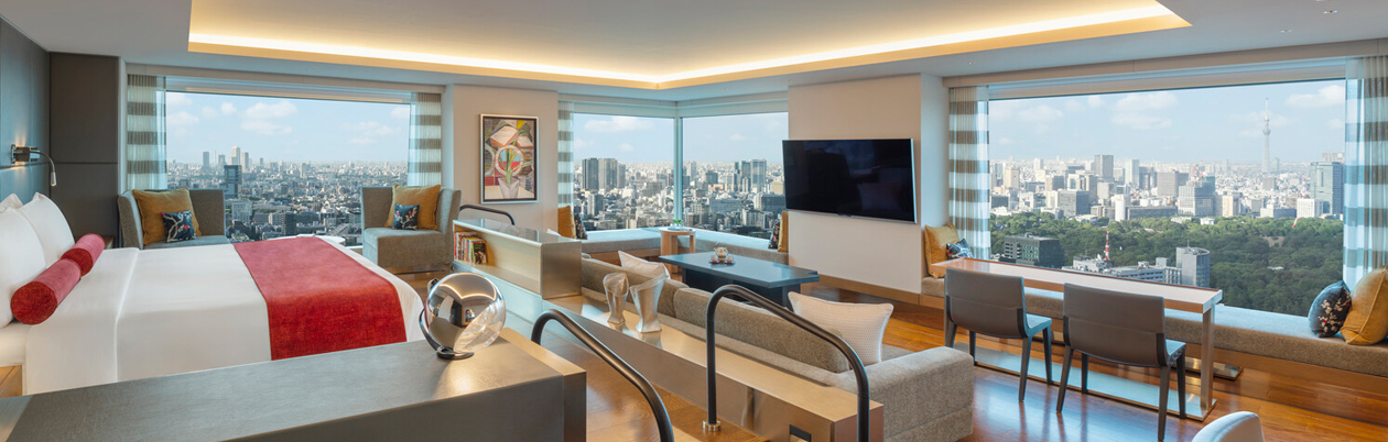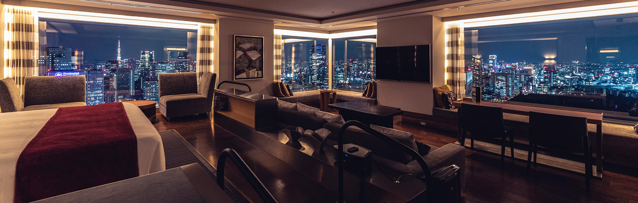 ダイナミックに広がる都心の眺望と室内のデザインが調和し、一つのアート作品として完成したスタイリッシュな客室。