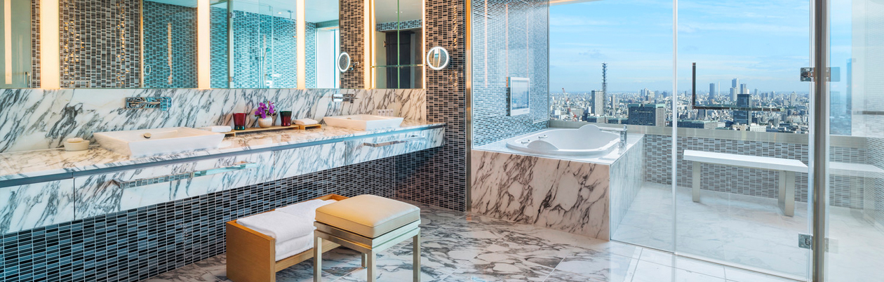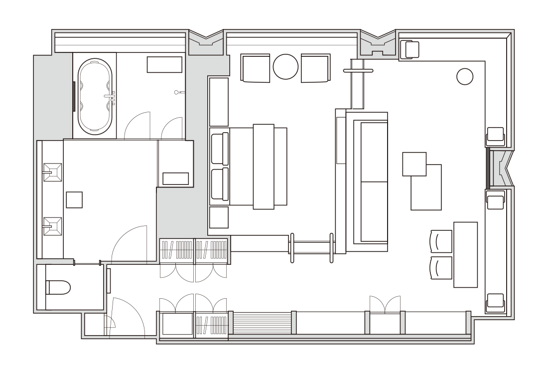 ユニークで斬新な間取りと、二面に設けられた窓からのパノラマビューが上質な滞在を演出します。ミストサウナ・ブロアバスを完備した広いビューバスも特徴的です。