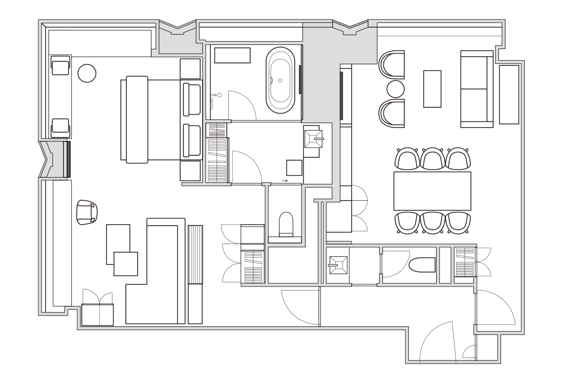 自然光が差し込むベッドスペースと、ゆったりとおくつろぎいただけるリビングスペースをご用意しております。お客さまのスタイルにあわせてお過ごしいただけるスイートルームです。