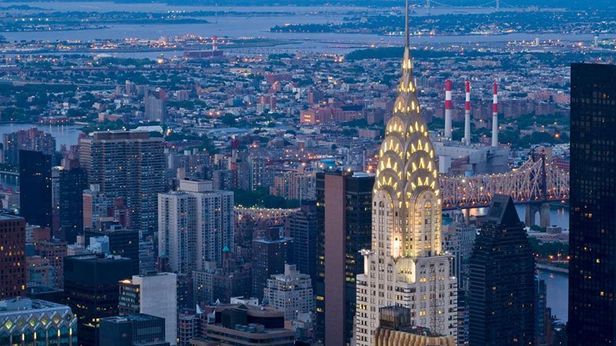 レキシントンアベニューにあるクライスラービルは、そのクラシック・アメリカンな美しい外観で、ニューヨークのスカイラインに特別な威厳を与えています。この77階建てのビルは、クライスラー自動車の本社として、1920年に竣工しました。その為、車の部品を形どった装飾が、個性的にあしらわれているのも特徴です。また、同ビルは、常にアメリカの人気建築ランキング10位以内にランクインしており、正統的アールデコの建築スタイルは、窓の形、スティールのウロコ状の尖塔部分で表現されています。