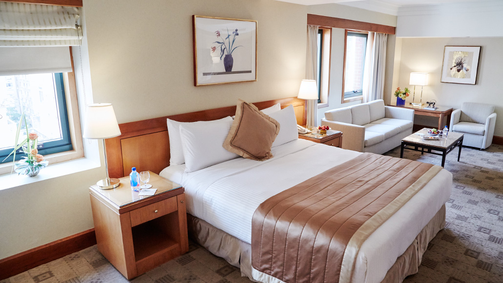 デラックスジュニアスイートキングルームは、キングサイズのベッドが一台備え付けられています。広々とした46㎡のお部屋にはワークデスク、ソファーとコーヒーテーブルがあります。大理石のゆったりしたバスルームには浴槽の他に、シャワーブースが設置されています。日中は活気にあふれ、また夜は落ち着いた雰囲気のパークアベニューの景観をお楽しみいただけます。