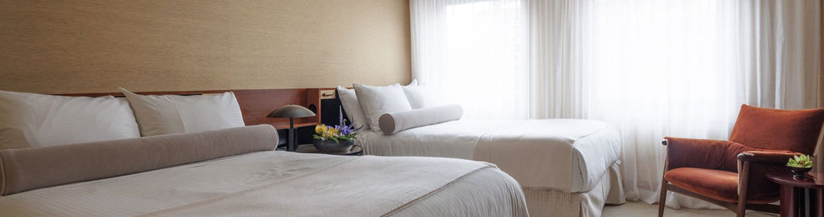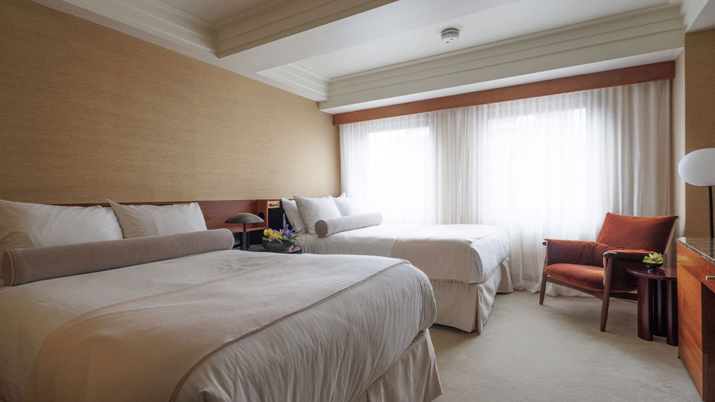 デラックスダブルルームは、広さ28㎡とゆったりとした空間にフルサイズベッドが2台備え付けられたお部屋です。桜材を施した落ち着きのあるデザインになっています。機能的なワークデスクや、大理石のバスルーム、深いバスタブとウォシュレットを完備しています。エンパイアステートビルまたはインテリアビューの景観がお楽しみいただけます。