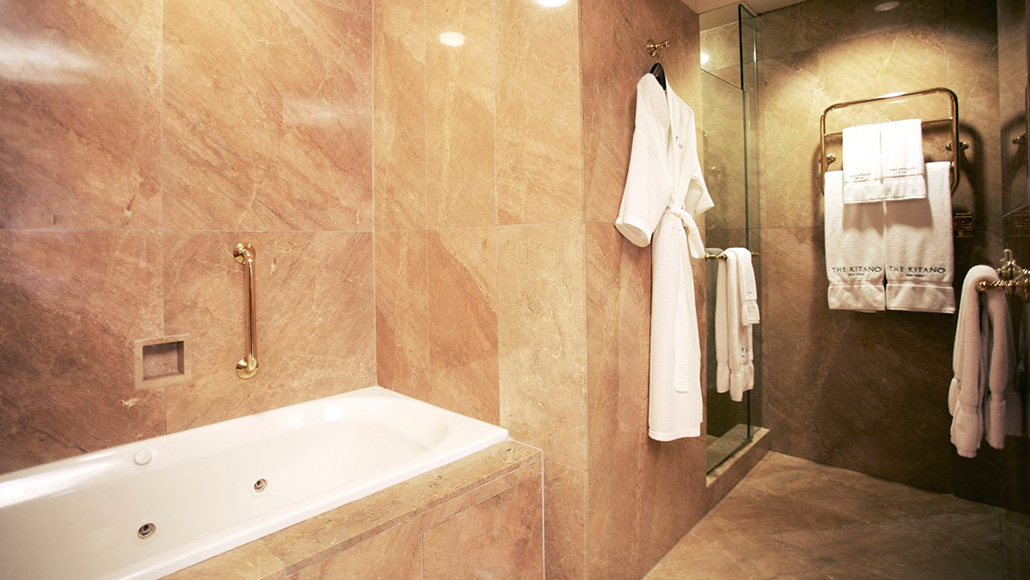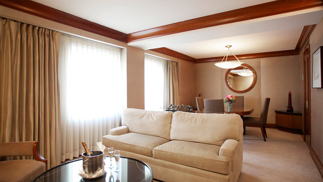 17階にあるエグゼクティブスイート5は89㎡の広々としたワンベッドルームスイート。マスターベッドルームには、フルサイズベッド2台、バスルームにはジャグジーバスとシャワールーム、2つの洗面台があり、ウォシュレットも完備しています。リビングルームには、ソファーベッド、アームチェア、コーヒーテーブルと4人掛けのダイニングテーブルがあり、ご旅行中もアットホームにくつろげるスペースとなっています。さらに、エントランス部分に隣接して、ウェットバーが設置されているので、ゲストをお迎えする際にご利用いただけます。また、同部屋からのエンパイアステートビルディングの眺めは格別です。