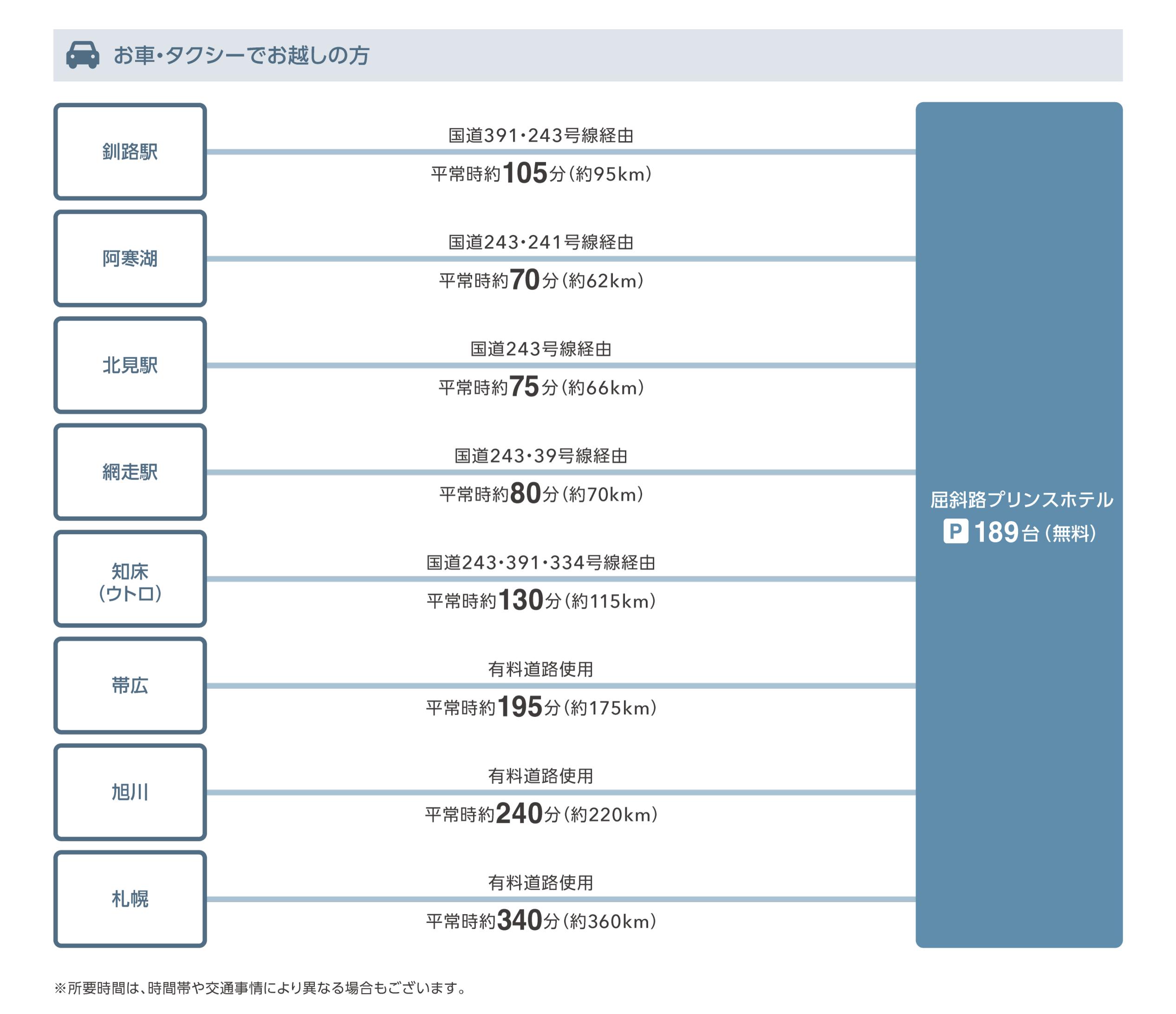 (記載の時間は最短で乗り継いだ場合のお時間です) - お車・タクシーでお越しの場合は