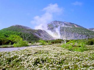 赤茶色の山肌から絶え間なく噴煙が上がる硫黄山。その光景とは対照的に、6月中旬~7月初旬には白い花の「エゾイソツツジ」の群落が目の前に広がります。