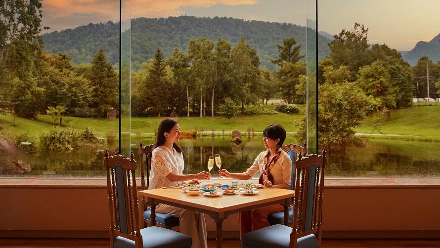 大きな池と緑に囲まれた、ガラス張りのレストラン。開放感の中でゆったりと出来たての料理をご堪能ください。