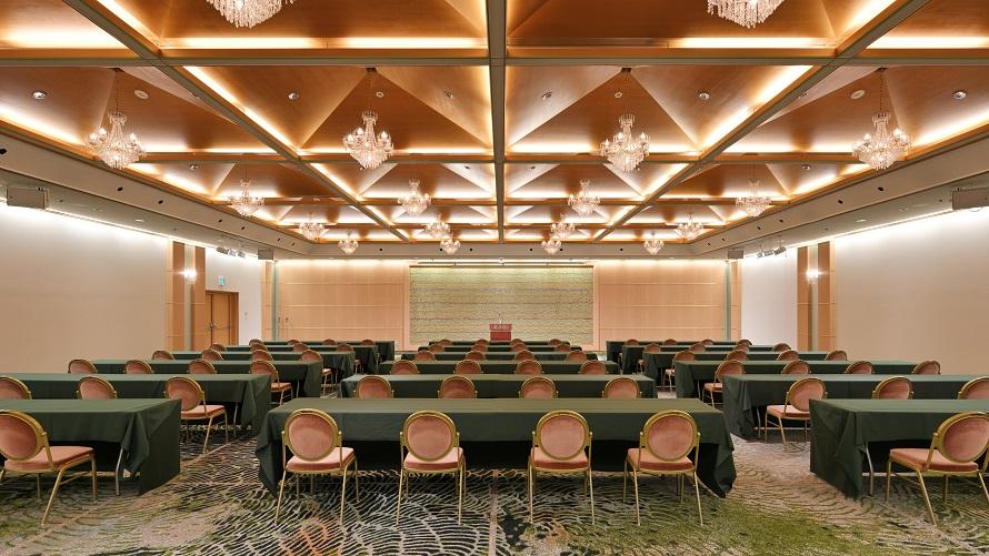 シアター形式で最大300名さま、ご会食は120名さままで収容可能で、会議から会食に幅広くご利用いただけます。