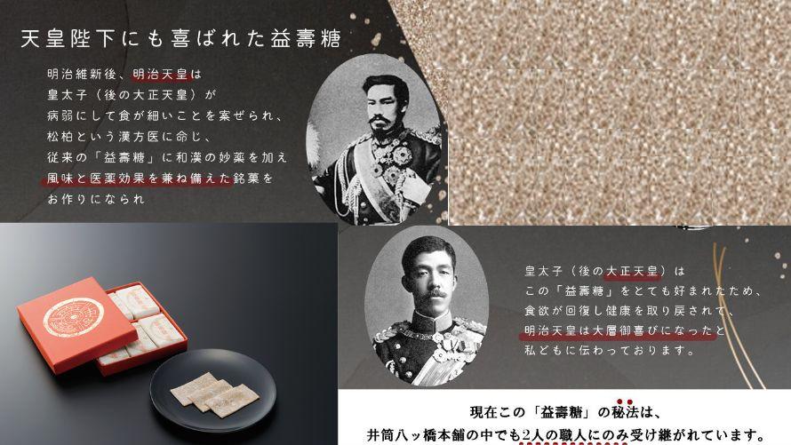 古くは江戸中期・享保年間より、滋養菓子として和漢薬商が全国に頒布していた『益壽糖(えきじゅとう)』。それは後に、食が細い皇太子(後の大正天皇)を案ぜられた明治天皇の命によって、和漢の妙薬を加えた銘菓となりました。この『益壽糖』を皇太子は大変好まれ、食欲も回復、健康を取り戻されたといいます。 そして300年近い歴史を経た現在、幻の仙菓の秘法は、白井洪庵ただ一人に伝承されたのです。主原料のもち米、蜂蜜、和三盆糖に高麗人参、霊芝など和漢成分8種類を加えています。気品に満ちた香りと豊潤な味わいが広がります。