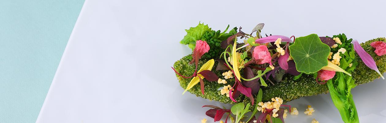 繊細で美しい彩りで盛りつけたお皿の上のアートコラボレーション。