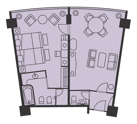 デラックスフロア(5~6階)に位置し、幅1,280mmのベッドを2台備えた79.2㎡の客室です。ツインのベッドルームと連なる広々としたリビングルームには建築家村野藤吾氏デザインのダイニングテーブルと応接セットをご用意しています。ベッドは米国で1881年の創業以来、つねに心地よい眠りを追求してきたシーリー社によるオリジナルベッドです。また快適にお過ごしいただくため、室内には49インチのテレビ、カプセル式コーヒーメーカーを備えています。バスルームにはバスタブとは別に、独立したシャワーブースがございます。