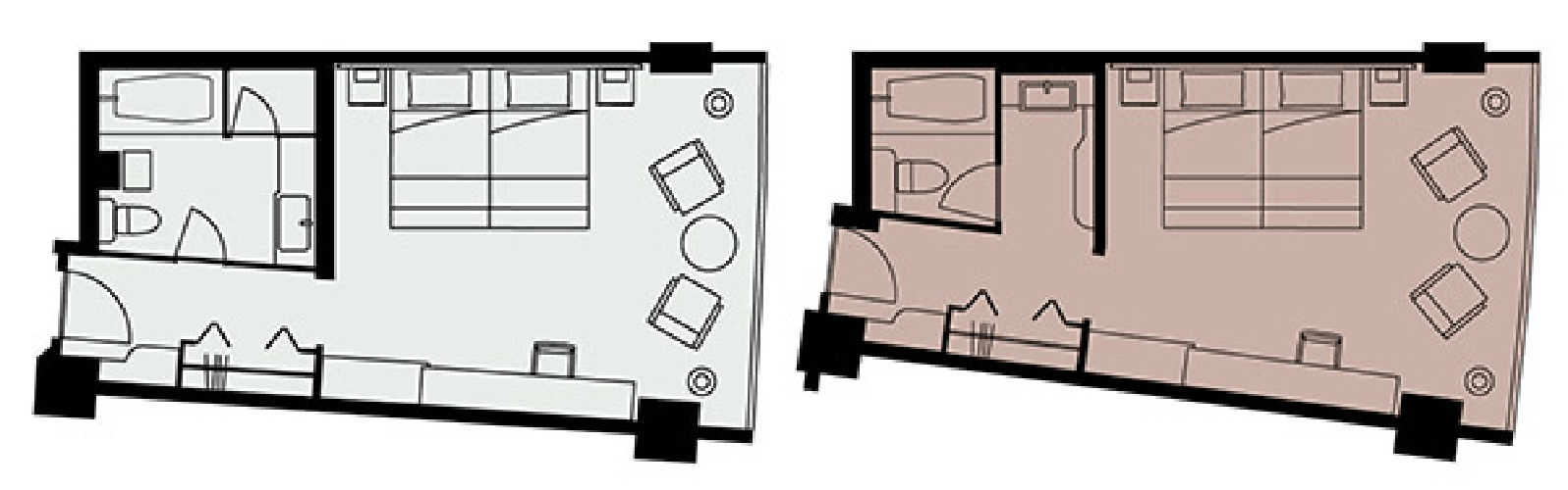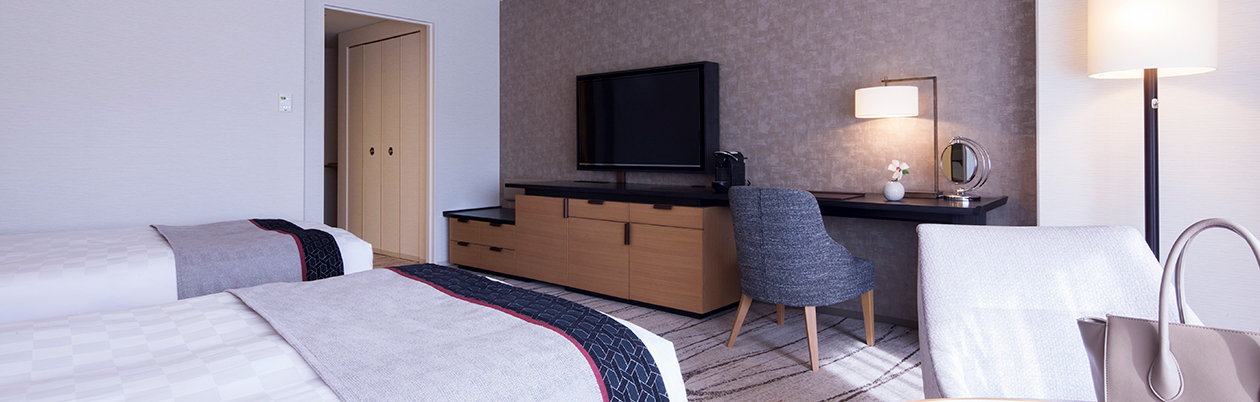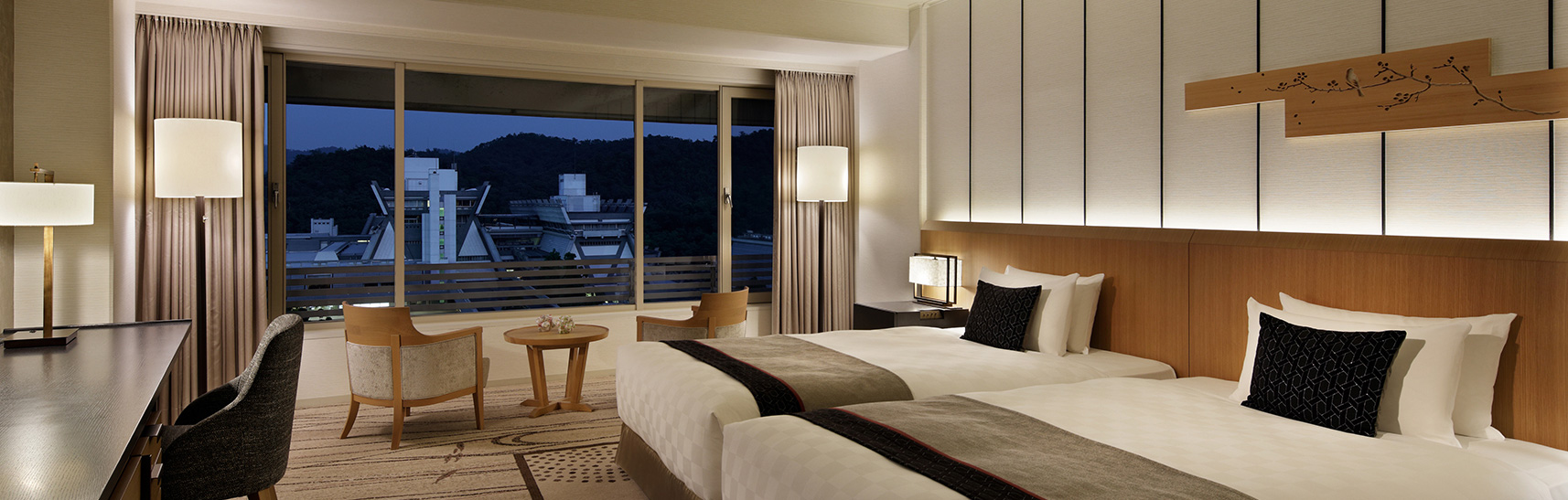 クラブフロアの7階に位置し、幅1,220mmのベッドを2台備えた39.6㎡の客室です。窓際にゆとりあるソファが配置され、洛北の自然を感じる景色を眺めることができます。ベッドは米国で1881年の創業以来、つねに心地よい眠りを追求してきたシーリー社によるオリジナルベッドです。また快適にお過ごしいただくため、室内には49インチのテレビ、カプセル式コーヒーメーカーを備えています。バスルームはバスタブとは別に、独立したシャワーブースがある41.9㎡の客室タイプもございます。