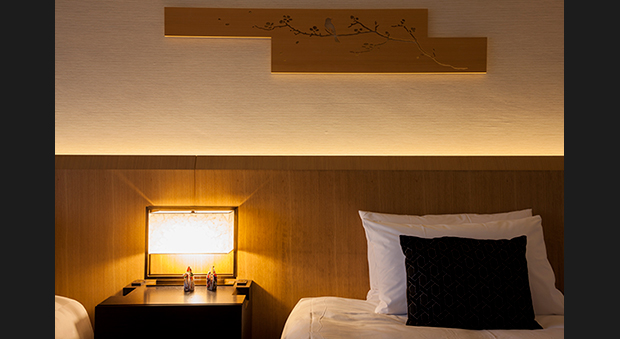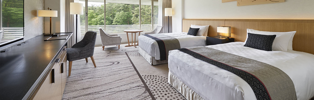 クラブフロアの7階に位置し、幅1,220mmのベッドを2台備えた39.6㎡の客室です。窓際にゆとりあるソファが配置され、洛北の自然を感じる景色を眺めることができます。ベッドは米国で1881年の創業以来、つねに心地よい眠りを追求してきたシーリー社によるオリジナルベッドです。また快適にお過ごしいただくため、室内には49インチのテレビ、カプセル式コーヒーメーカーを備えています。バスルームはバスタブとは別に、独立したシャワーブースがある41.9㎡の客室タイプもございます。
