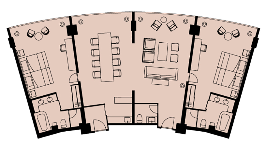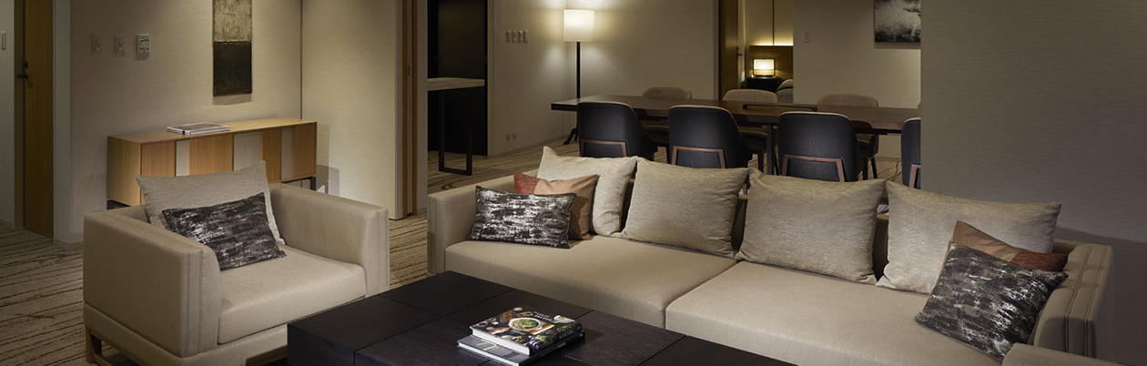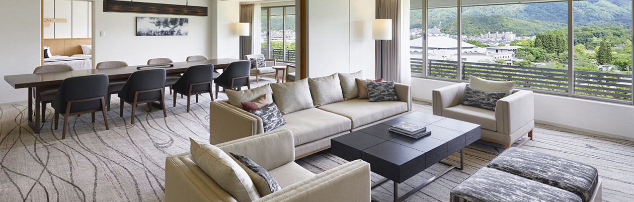 クラブフロア7階に位置するクラブグランドスイートは、2つのベッドルーム、リビングスペース、ダイニングスペースからなる158.4㎡のスイートルームです。目の前に広がる大きな窓からは、標高848mの比叡山や、台形と逆台形の空間の組み合わせで構成されたユニークな建築である国立京都国際会館をご覧いただけます。ベッドは米国で1881年の創業以来、つねに心地よい眠りを追求してきたシーリー社によるオリジナルベッドです。また快適にお過ごしいただくため、室内には49インチのテレビ、カプセル式コーヒーメーカーを備えています。ゆとりのご滞在を存分にご満喫ください。