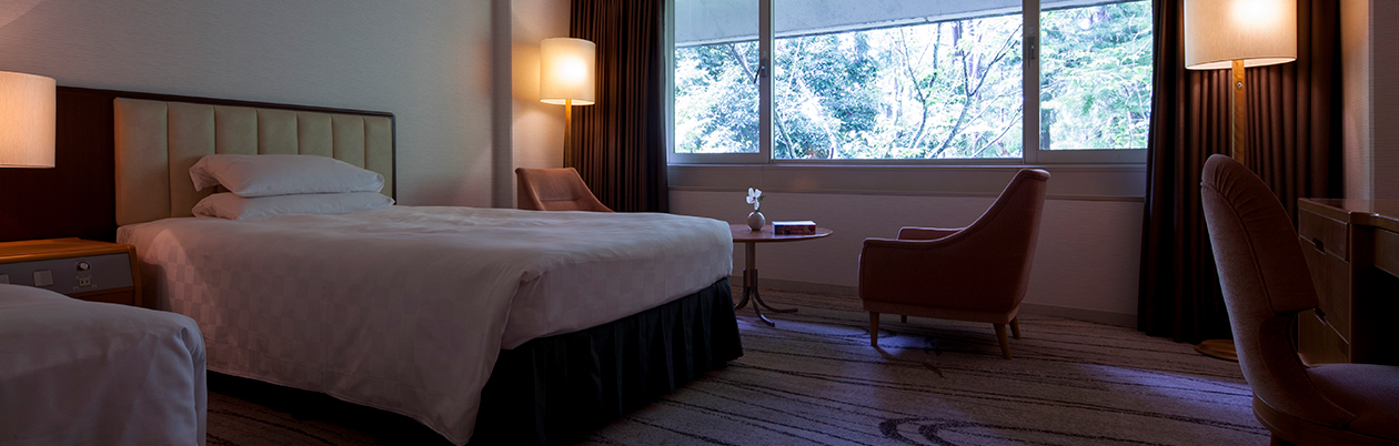 フォレストフロア(2~4F)に位置するフォレストフロアツインは、幅117cmのベッド2台を備えた36.9㎡の客室です。窓際には建築家村野藤吾氏デザインのソファとテーブルが配置されています。ベッドはフランスベッドを採用しています。快適にお過ごしいただくため、室内には49インチのテレビ、カプセル式コーヒーメーカーを備えています。バスルームはバスタブとは別に、独立したシャワーブースがある39.2㎡の客室タイプもございます。3名さまでご利用の場合、1台はエキストラベッドのご用意となります。洛北の自然を間近に感じられる客室で、こころ和むご滞在をお過ごしください。