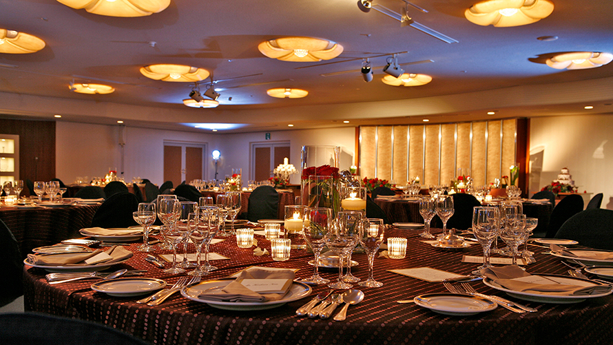 落ち着いたクラブハウス風のパーティー会場。シャープなイメージでありながら、アットホームな距離感を作ることができるバンケットです。「ローズルーム」専用の飾り棚を設置することができます。