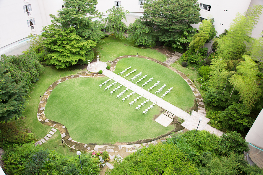ホテルの中央に広がる四季折々の美しい自然に包まれたガーデン。ガーデンを囲む緑の木々たち、そしてハートの小径、風の音、木々の音、小鳥のさえずりなど自然のベールに護られた挙式が叶う。