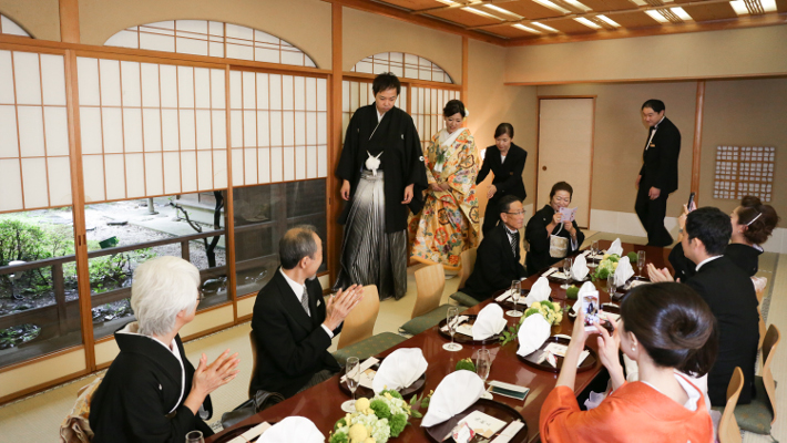 新婦さまはお母さまと、新郎さまは親族の皆さまと一緒に