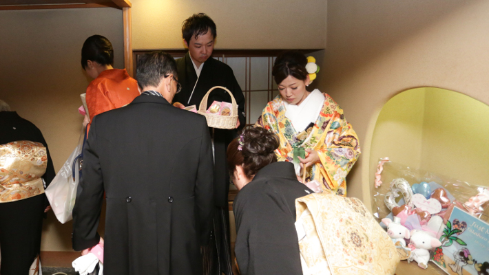 感謝の気持ちを込めて、引出物をひとりずつお渡し