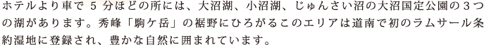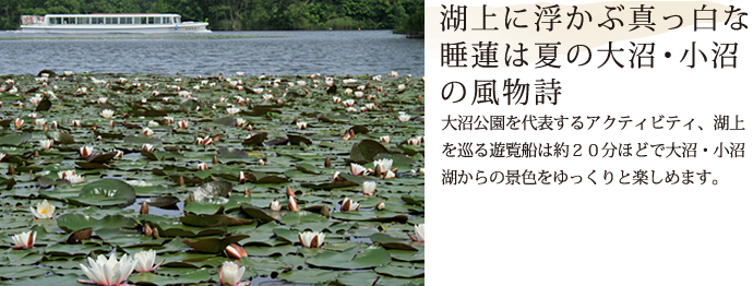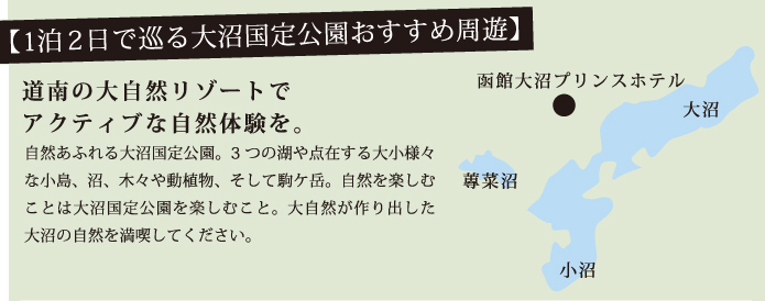 自然あふれる大沼国定公園。3つの湖や点在する大小様々な小島、沼、木々や動植物、そして駒ケ岳。自然を楽しむことは大沼国定応援を楽しむこと。大自然が作り出した大沼の自然を満喫してください。