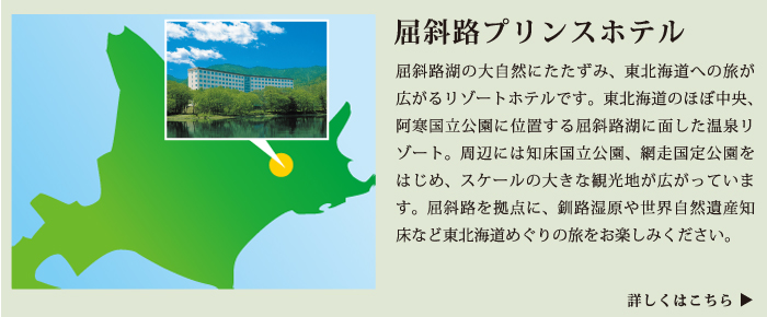屈斜路湖の大自然にたたずみ、東北海道への旅が広がるリゾートホテルです。東北海道のほぼ中央、阿寒国立公園に位置する屈斜路湖に面した温泉リゾート。周辺には知床国立公園、網走国定公園をはじめ、スケールの大きな観光地が広がっています。屈斜路を拠点に、釧路湿原や世界自然遺産知床など東北海道めぐりの旅をお楽しみください。