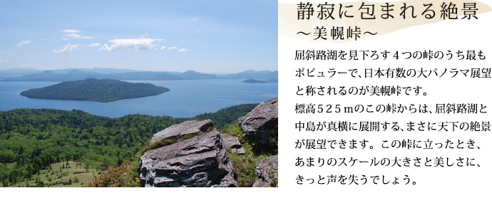 屈斜路湖を見下ろす4つの峠のうち最もポピュラーで、日本有数の大パノラマ展望と称されるのが美幌峠です。標高525mのこの峠からは、屈斜路湖と中島が真横に展開する、まさに天下の絶景が展望できます。この峠に立ったとき、あまりのスケールの大きさと美しさに、きっと声を失うでしょう。