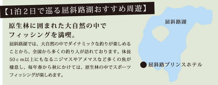 屈斜路湖では、大自然の中でダイナミックな釣りが楽しめることから、全国から多くの釣り人が訪れております。体長50cm以上にもなるニジマスやアメマスなど多くの魚が棲息し、毎年春から秋にかけては、原生林の中でスポーツフィッシングが楽しめます。
