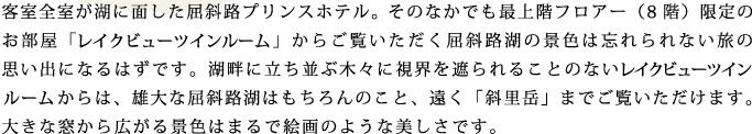 窓からは絵画のような景色 客室全室が湖に面した屈斜路プリンスホテル。そのなかでも最上階フロアー(8階)限定のお部屋「レイクビューツインルーム」からご覧いただく屈斜路湖の景色は忘れられない旅の思い出になるはずです。湖畔に立ち並ぶ木々に視界を遮られることのないレイクビューツインルームからは、雄大な屈斜路湖はもちろんのこと、遠く「斜里岳」までご覧いただけます。大きな窓から広がる景色はまるで絵画のような美しさです。