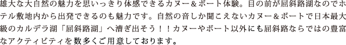 雄大な大自然の魅力を思いっきり体感できるカヌー&ボート体験。目の前が屈斜路湖なのでホテル敷地内から出発できるのも魅力です。自然の音しか聞こえないカヌー&ボートで日本最大級のカルデラ湖「屈斜路湖」へ漕ぎ出そう!!カヌーやボート以外でも屈斜路ならではの豊富なアクティビティを数多くご用意しております。