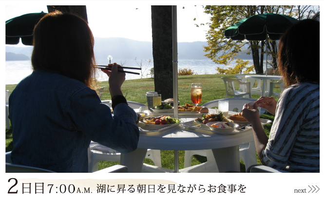 天然芝のプライベートガーデンでの「自然体験型の朝食バイキング」をご提案いたします。プライベートガーデンは、静かな十和田湖が本当に目の前!爽やかな空気と風を感じながらお食事していただけます。