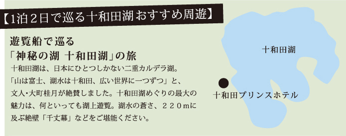 十和田湖は、日本にひとつしかない二重カルデラ湖。「山は富士、湖水は十和田、広い世界に1つずつ」と、文人・大町桂月が絶賛しました。十和田湖巡りの最大の魅力は、何といっても湖上遊覧。湖水の蒼さ、220mに及ぶ絶壁「千丈幕」などをご堪能ください。