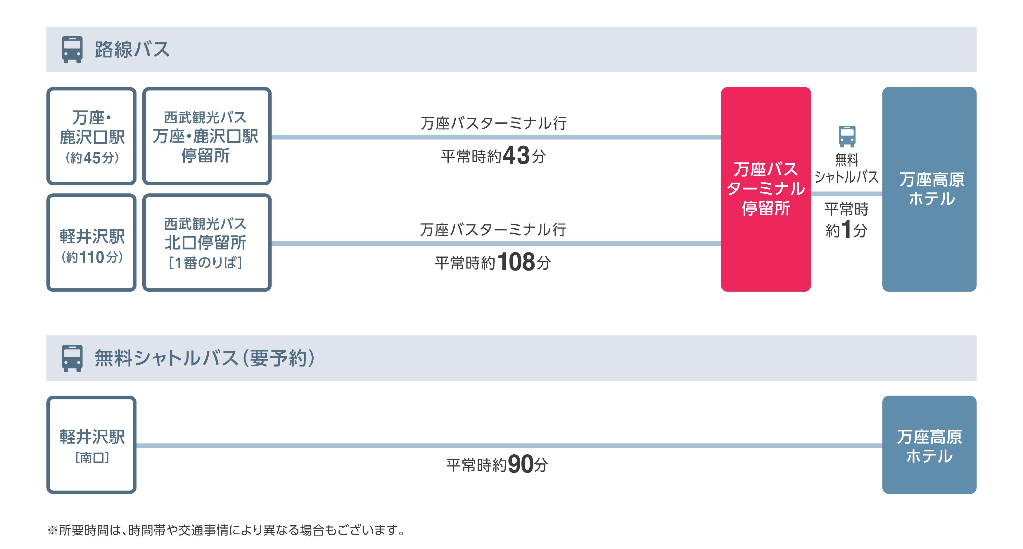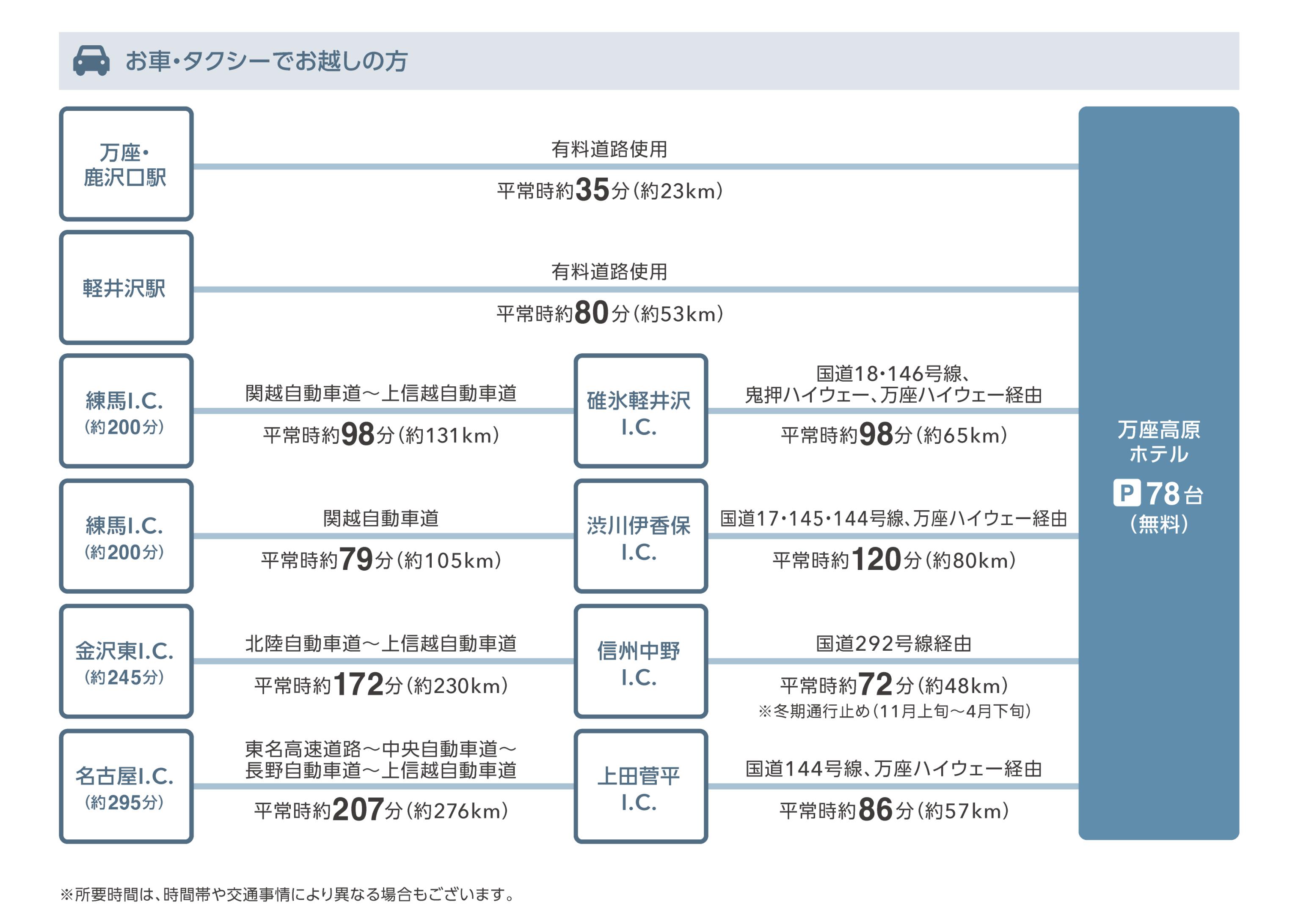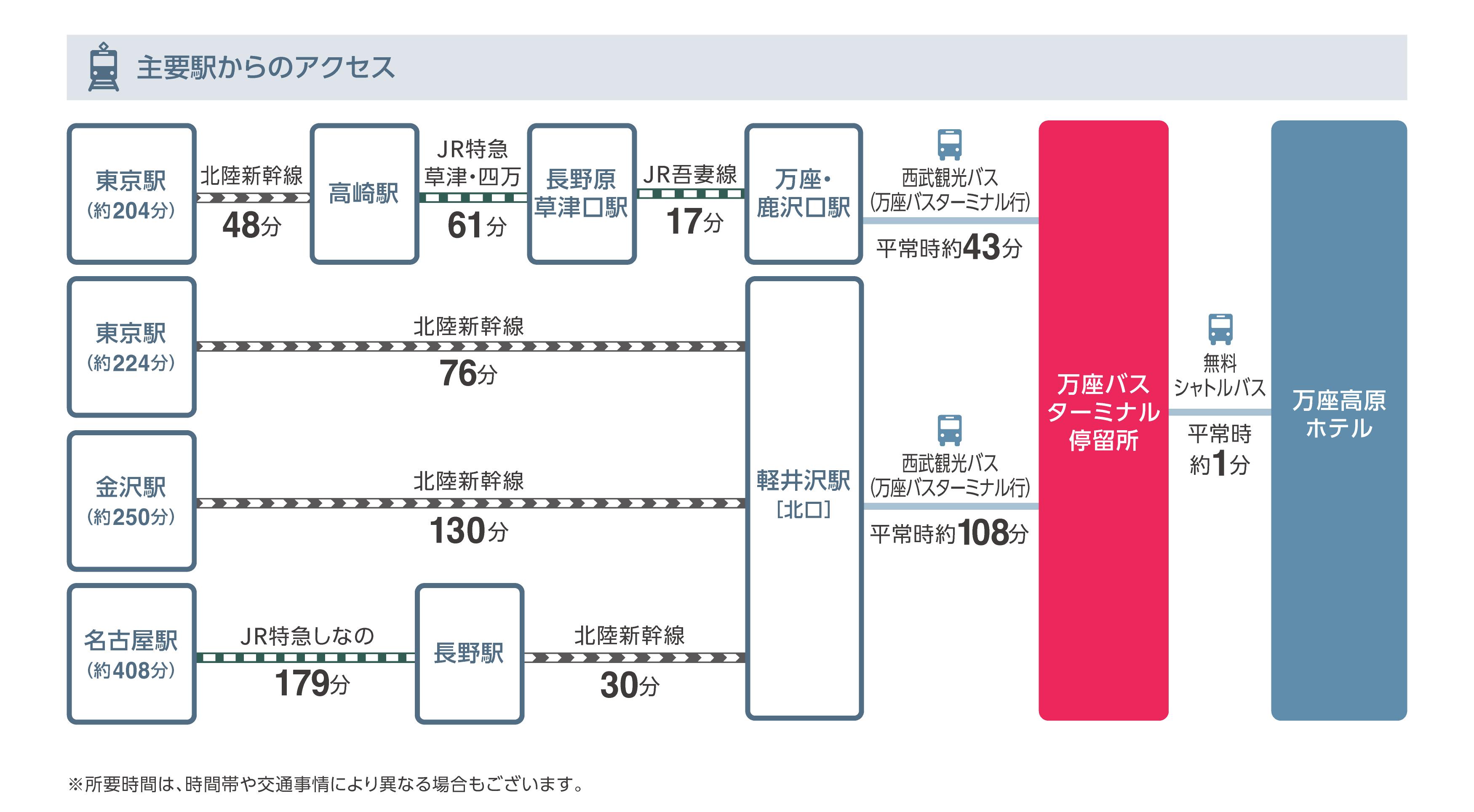 乗車地 所要時間 北陸新幹線『軽井沢駅』南口 平常時約90分 ※交通状況により遅れる場合がございます。新幹線等の乗り継ぎの際は時間に余裕を持ってご利用下さい。