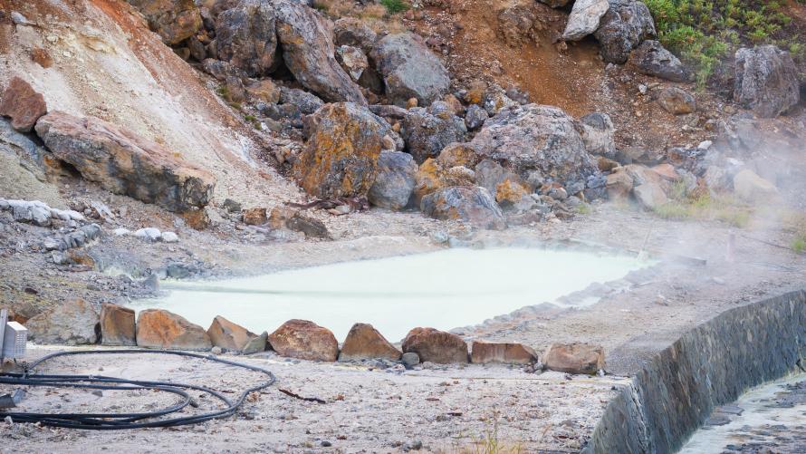 万座温泉の最大の源泉“姥湯”。約80℃のお湯が毎分1,100リットルという豊富な湯量を誇っています。万座薬師堂