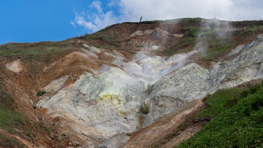 万座温泉のシンボル的な存在。昔、噴火口だった小高い山の中腹からは水蒸気を含んだ火山性ガスが吹き出しています。湯畑
