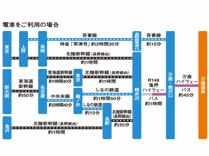 乗車地 所要時間 北陸新幹線『軽井沢駅』南口 平常時約1時間30分 ※交通状況により遅れる場合がございます。新幹線等の乗り継ぎの際は時間に余裕を持ってご利用下さい。