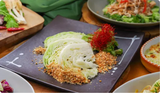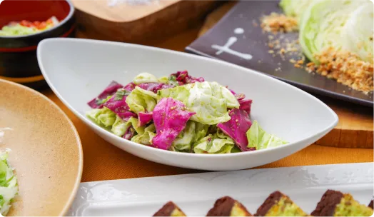 キャベツ419をサッと蒸して食感を残しつつ、旨みをぎゅっと引き出す。仕上げには、香ばしく炒った特製のガーリックパン粉をひと振り。香りとコクがキャベツの甘みをさらに引き立て、シンプルながらもキャベツ419の旨味が詰まった一品です。