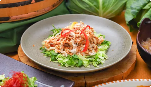 シャキッとした食感を残すように火入れしたキャベツ419は、加熱しても甘みが際立ち、黒酢のきいたピリ辛ダレが、キャベツ419のやさしい甘みと蒸し鶏のあっさりとした旨みを引き立て、食欲をそそる一皿です。