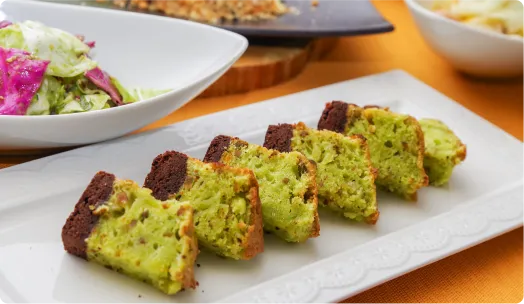 下段の香り豊かなオレンジピールを混ぜ込んだブラウニーを大地に見立て、その上に重なるのは、塩ゆでしたキャベツ419とピスタチオの食感が楽しいパウンドケーキ。ほうれん草のピューレで淡い緑色をまとわせ、大地に芽吹く瑞々しい緑を表現しました。