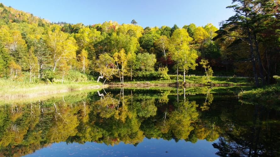 風のない日は、色付いた木々が水面に鏡のように映し出されます。