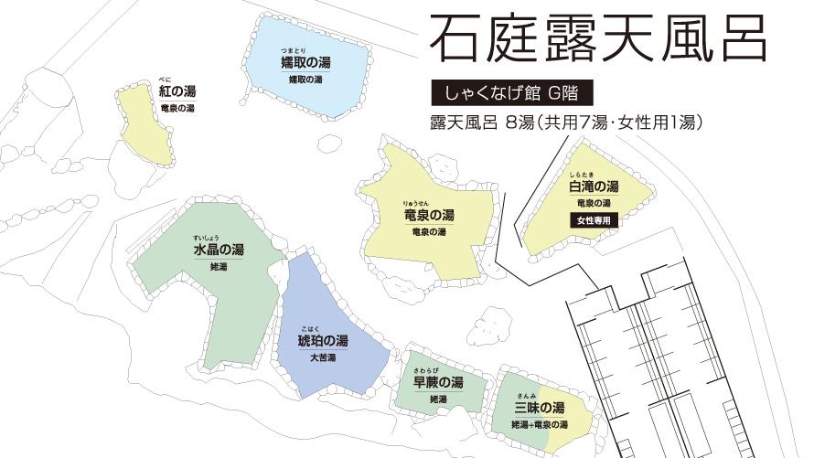 石庭露天風呂は、「女性専用(白滝の湯)」以外は男女共用となっております。