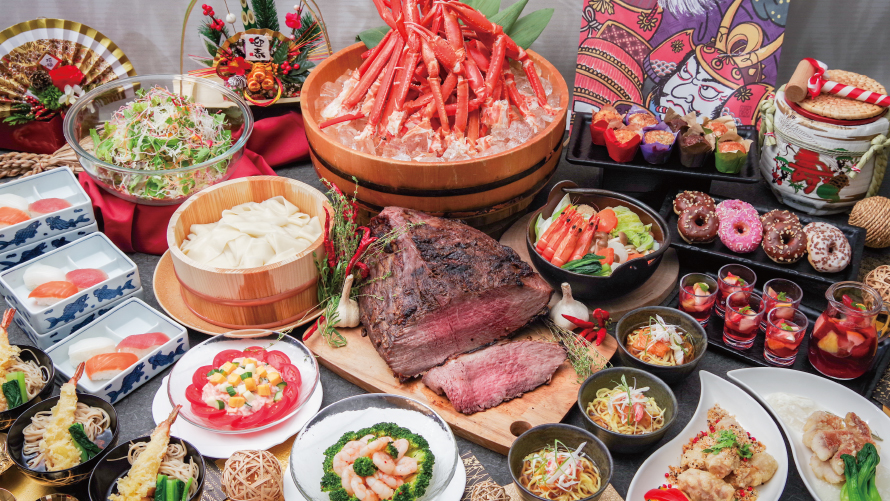 ボイル蟹、ローストビーフをメインに地元食材を取り入れたバラエティあふれる和洋中ブッフェ。