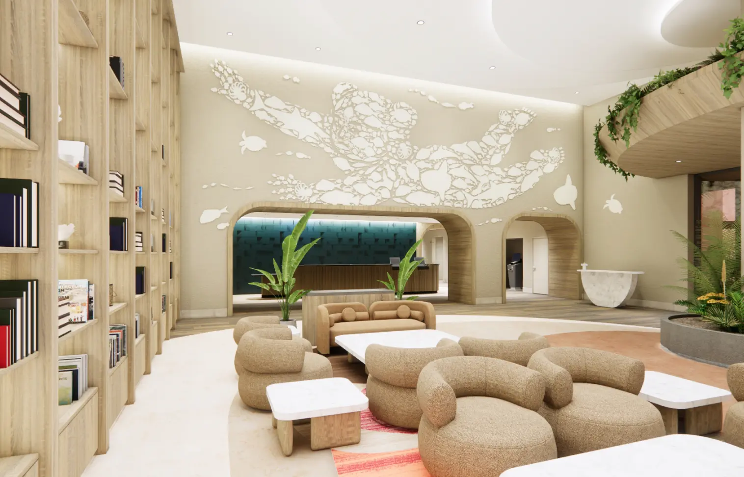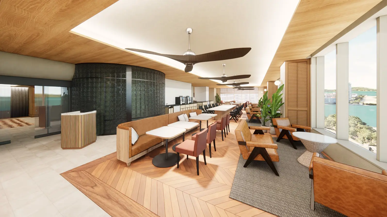 On the 1F lobby wall, you will find a magnificent mural with the theme "Prince of the Ocean," created by Hiromine Nakamura, the fourth generation of Nakamura Ningyo. Each of the parts that make up the mural is in the shape of a sea creature, and the work is a fusion of Japanese history, natural features, and beach culture connected to the seas of Fukuoka. A cafe stand is also located in the lobby, open to all visitors (including non-hotel guests) for casual use.