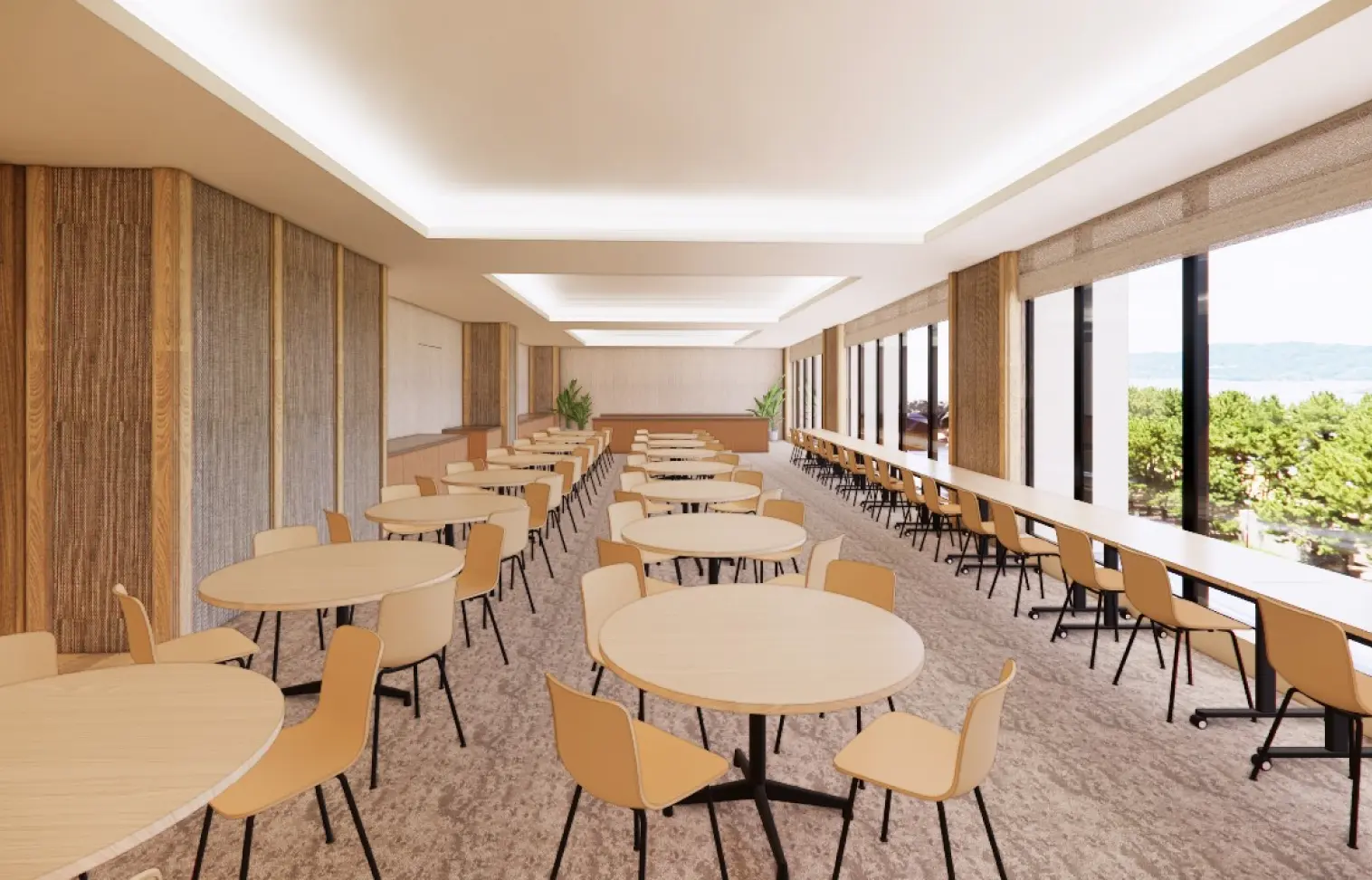 An event hall that can accommodate a wide variety of occasions from conferences to banquets. The room size and table layout can be flexibly adjusted to suit the purpose of your event.