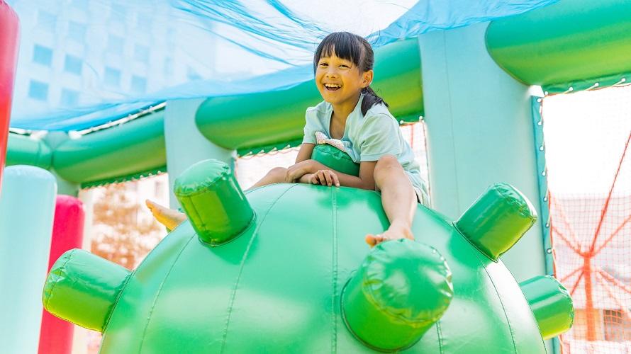 走って、跳ねて、滑って…。そんな全身を使った遊びが大好きなこの年齢の子どもたちには、苗場ならではのダイナミックな遊び場がぴったり。屋外では、小さな子でも安心して水遊びができるビニール製のエアープール「ふあふあプール」や、エアー遊具の「ふあふあジャンボスライダー」が大人気。