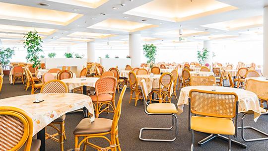 開放感溢れるレストラン。ホテルの目の前に広がる自然の景色を眺めながらお食事いただけます。